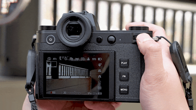 键、两个自定义按键以及一块1.28英寸肩屏,背面是电源按键、EVF/LCD切换按键、摇杆、后拨盘以及竖向排列的PLAY、FN、MENU按键,机身正面卡口与手柄之间有两个自定义按键
