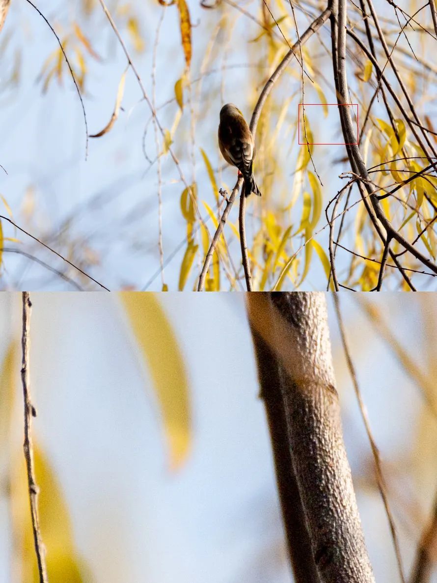 又或是下图中的喜鹊,它在画面中的占比不高,而且它与镜头之间有一根小树枝遮挡了画面,但SL3-S对焦起来依然没有压力。