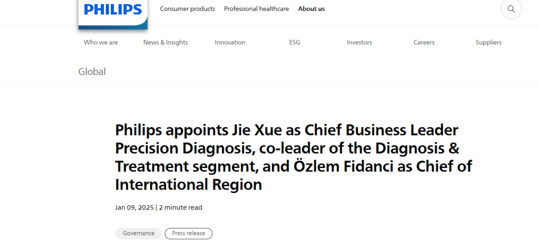 2025年1月9日,飞利浦宣布:自2025年1月1日起,薛洁女士将出任精准诊断业务首席执行官,Özlem Fidanci女士则将被任命为国际区域负责人。两位新任高管已正式加入飞利浦执行委员会,并将直接向首席执行官Roy Jakobs汇报工作。薛洁将接管曾由Bert van Meurs临时领导的精准诊断业务。Bert van Meurs则将继续专注于领导飞利浦的图像引导治疗业务。未来,薛洁女士将与Bert van Meurs先生携手,共同负责诊疗(D&T)部门的整体运营和发展。