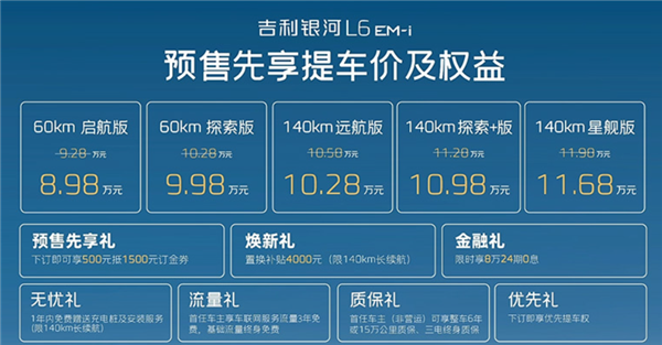 快科技1月18日消息,日前,吉利官方宣布,银河L6 EM-i正式开启预售,新车共推出5款车型,预售价区间为9.28-11.98万元,预售先享提车价8.98-11.68万元,该车也是雷神EM-i超级电混首款轿车。