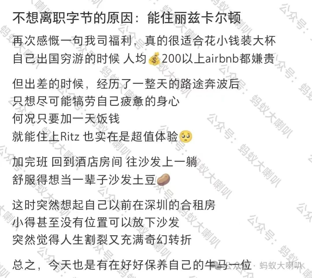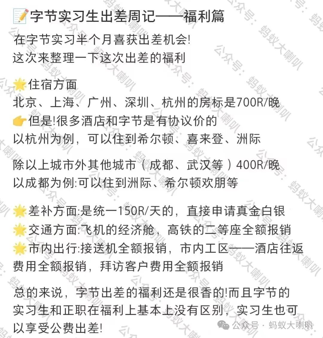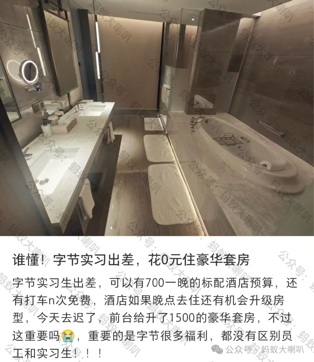 写到这里,很多人会不理解:“不是,字节员工那么爱出差吗?没事出差啥啊!”你要知道,在字节,出差的标准:五星酒店,接送机,外加150元补贴一天。下面是某平台上字节员工分享自己出差的感受,至少在吃、行、住的标准上他们是很满意的。