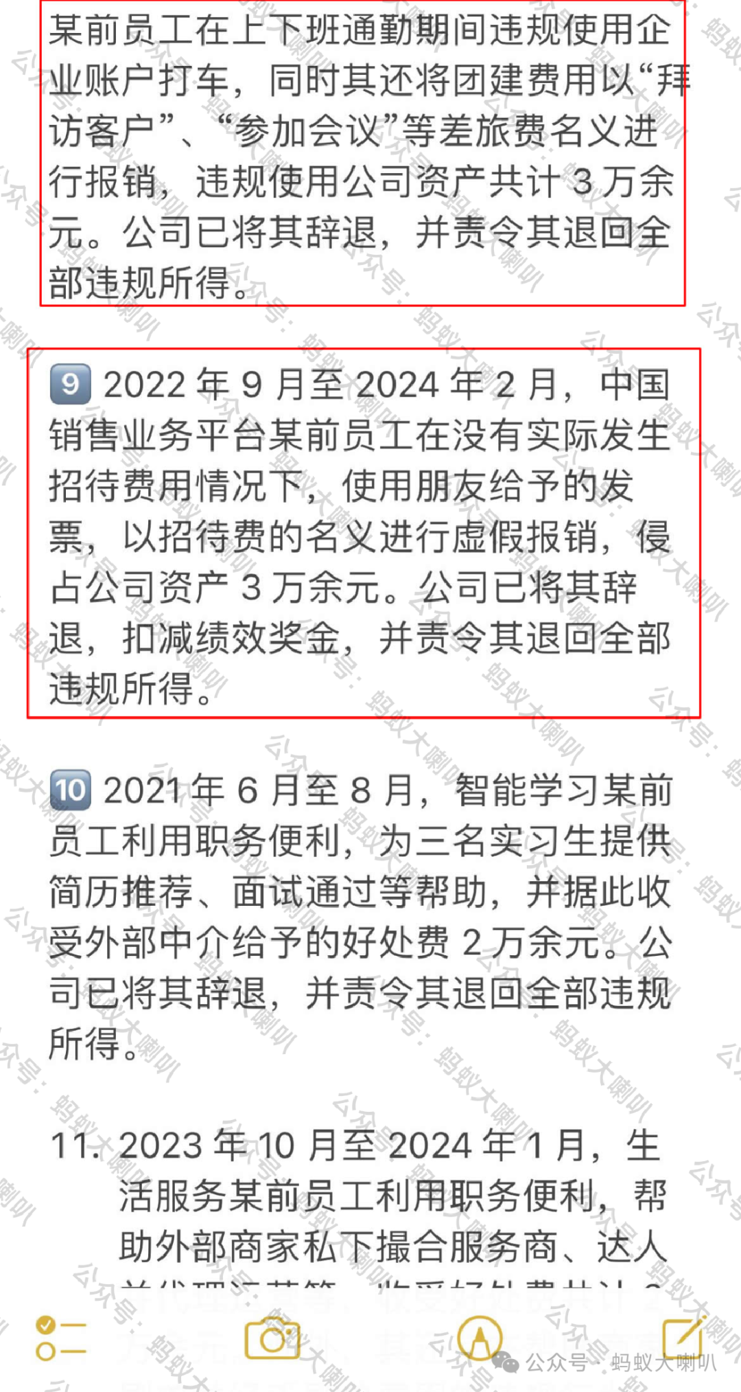 字节的业务遍布国内外,因此每年肯定会产生大量的差旅费用,这里面难免有些人浑水摸鱼。2024年字节发布的反腐通告里面就到的案例不少是出差违规报销问题。结果是员工被辞退,并且拉入行业黑名单。