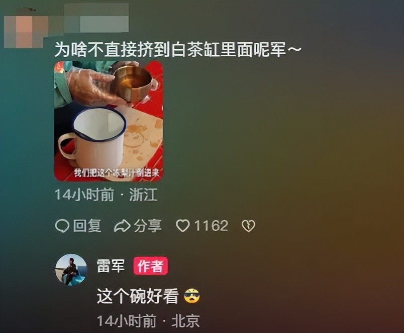 有网友提问为什么不直接将冻梨汁挤进茶缸里,雷军回应称“碗好看”。