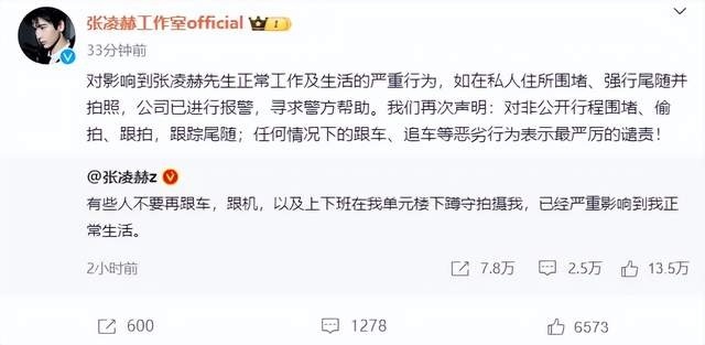 张凌赫工作室也转发该博文,并表示:“对影响到张凌赫先生正常工作及生活的严重行为,如在私人住所围堵、强行尾随并拍照,公司已进行报警,寻求警方帮助。我们再次声明:对非公开行程围堵、偷拍、跟拍,跟踪尾随;任何情况下的跟车、追车等恶劣行为表示最严厉的谴责!”