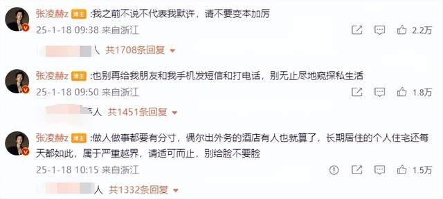 张凌赫写道:“有些人不要再跟车,跟机,以及上下班在我单元楼下蹲守拍摄我,已经严重影响到我正常生活。”