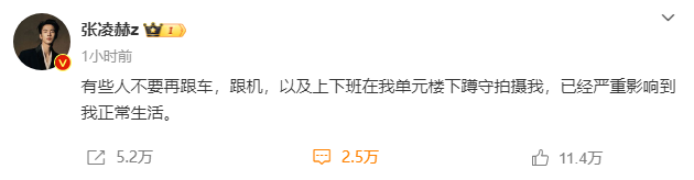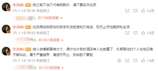 张凌赫工作室也转发该博文,并表示:“对影响到张凌赫先生正常工作及生活的严重行为,如在私人住所围堵、强行尾随并拍照,公司已进行报警,寻求警方帮助。我们再次声明:对非公开行程围堵、偷拍、跟拍,跟踪尾随;任何情况下的跟车、追车等恶劣行为表示最严厉的谴责!”