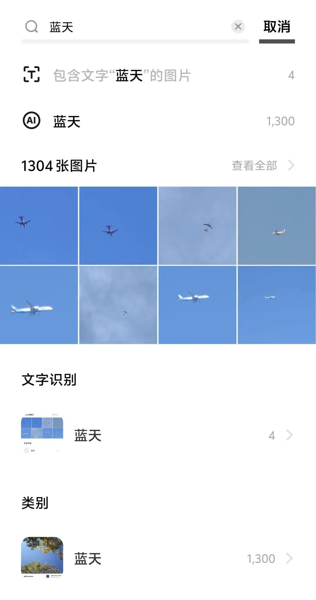 我在相册搜索“蓝天”,结果它只支持识别带有蓝天文字的图片。