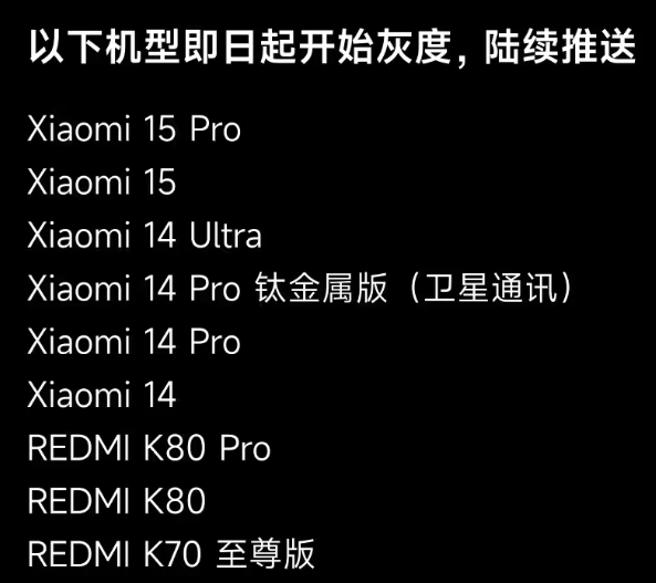 Xiaomi 15 Pro、Xiaomi 15、Xiaomi 14 Ultra、Xiaomi 14 Pro 钛金属版(卫星通讯)、Xiaomi 14 Pro、Xiaomi 14、REDMI K80 Pro、REDMI K80、REDMI K70 至尊版