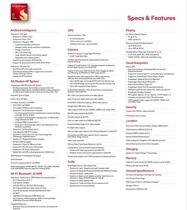 据悉,骁龙8 Elite采用8核设计,包含2颗主频4.32GHz的超大核和6颗3.53GHz的大核组成。