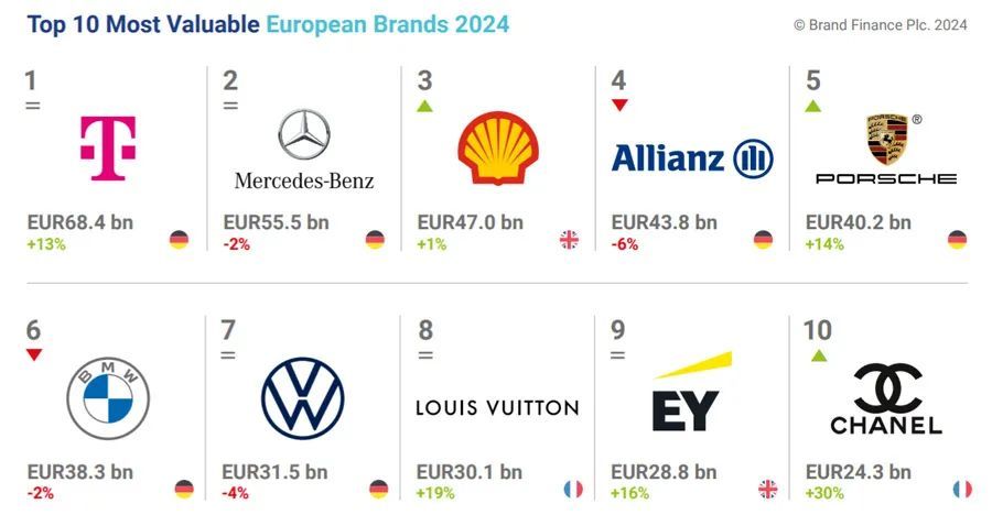 英国品牌评估机构“品牌金融”(Brand Finance)发布《2024欧洲品牌价值500强》榜单(Europe 500 2024),德国电信、梅赛德斯奔驰、壳牌、安联集团、保时捷、宝马、大众、路易威登、安永和香奈儿名列前十名。