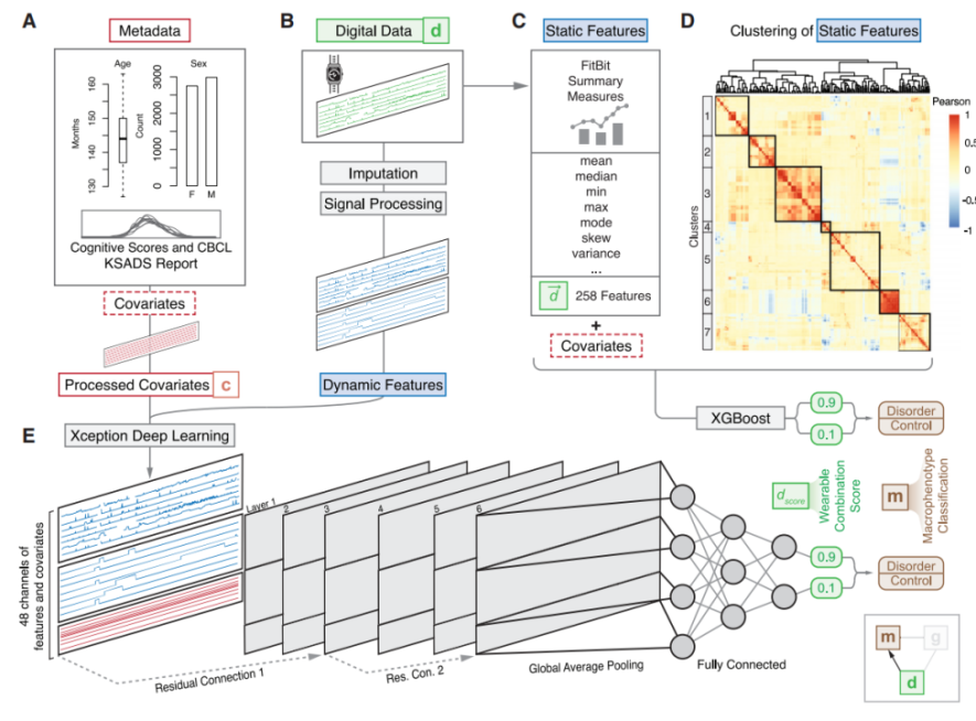 近年来,可穿戴设备因其便携性和连续性而成为收集个体行为数据的理想工具。然而,如何从海量的数据中提取有意义的信息一直是研究者们面临的挑战。本研究通过整合来自青少年脑认知发展研究(ABCD Study)的数据,利用先进的机器学习算法如XceptionTime、XGBoost等,实现了对注意缺陷多动障碍(ADHD)等多种精神疾病的精准预测和分类。此外,研究人员还进行了全基因组关联分析(GWAS),以探索潜在的遗传因素。