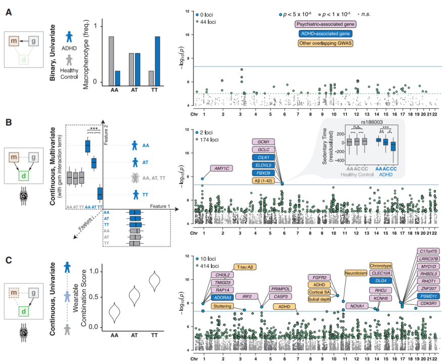 研究人员开发了一种创新的AI建模框架,利用穿戴式设备衍生的特征作为精神疾病宏表型的预测因子。选择1,191名个体(含137名ADHD患者和1,054名健康对照者)进行GWAS研究,以识别与精神疾病相关的遗传变异。