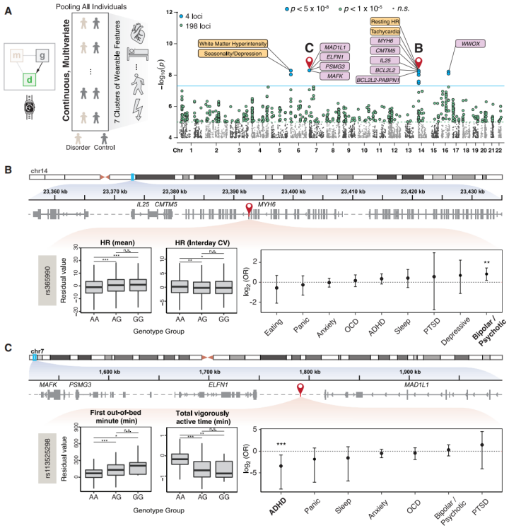研究人员不局限于针对特定疾病(如ADHD)的GWAS研究,还进一步探索了所有可穿戴设备特征在更广泛的精神疾病群体中的应用。在这项扩展性的多变量GWAS中,研究人员将可穿戴特征向量作为回归因变量,控制组为健康个体,实验组涵盖所有精神障碍患者。类似于之前的分析方法,进行后验测试以确定哪些具体特征驱动了显著的遗传关联。结果显示,四个位点达到了全基因组显著性水平,并涉及10个在神经发育性和精神病性障碍中有记录作用的基因(图5A)。