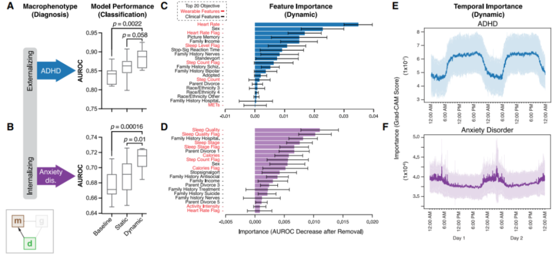 研究人员还探讨了一天中不同时间点上动态特征的重要性。利用梯度加权类激活映射(Grad-CAM)和消融技术,发现对于ADHD患者而言,下午早些时候的心率动态特征尤为重要,这可能反映了青少年ADHD患者与其同龄人在该时段的行为差异(图3E)。这种现象与临床研究中观察到的昼夜节律效应相吻合。相反,夜间睡眠相关的动态特征更有利于焦虑分类,这与临床预期相符(图3F)。