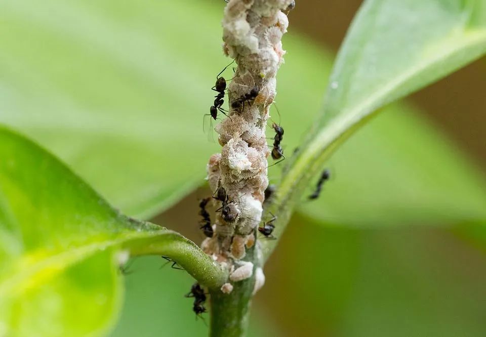 粉蚧虫会吸引蚂蚁过来,而蚂蚁就会在健康的植物上饲养粉蚧虫,这也是为什么家里的某棵植物感染粉蚧虫后,其他植物也会被传染,就是因为蚂蚁会把蚧壳虫搬到健康的植物上。