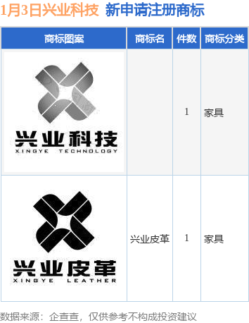 证券之星消息,根据企查查数据显示,近日兴业皮革科技股份有限公司新提交“兴业皮革”等2件商标注册申请。商标申请详情如下: