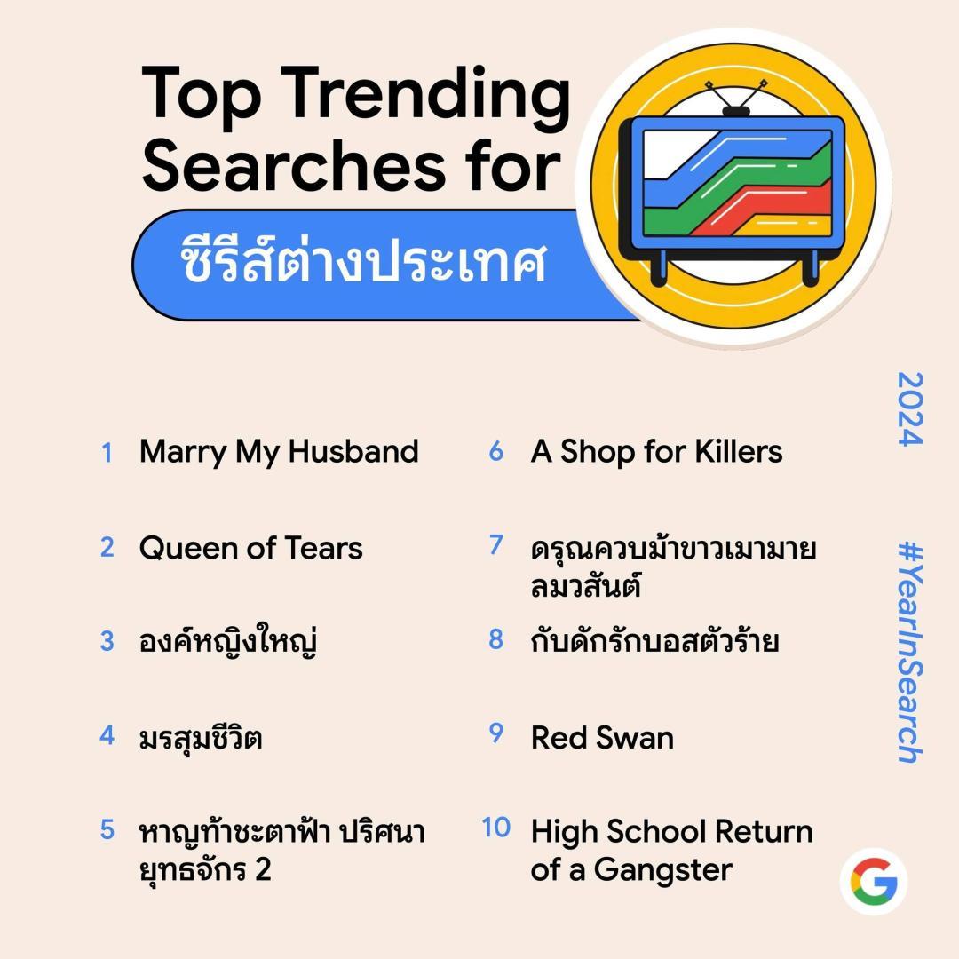 2024 年泰国人搜索最多的海外电视剧 Top 10 里,里边中国电视剧一共 5 部,分别是排第三的《 度华年》、第四的《 墨雨云间》、第五的《 庆余年 2 》、第七的《 少年白马醉春风》、第八的《 你也有今天》。