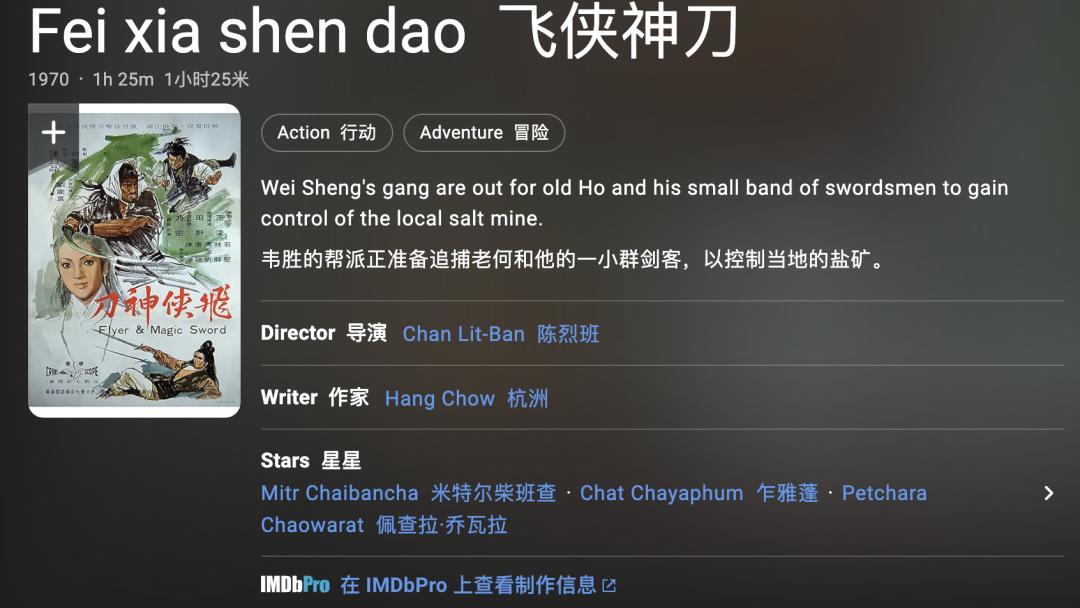 1970 年,双方合拍了武侠电影《 飞侠神刀 》,有几个主演就是泰国演员。