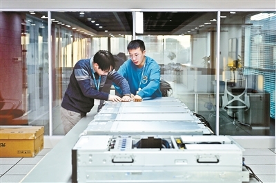 在识因智能机房,工作人员正在维护算力服务器