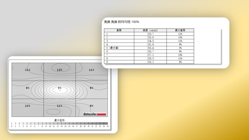 在亮度和色彩均匀性测试中,HKC G27H2Pro 显示器的表现同样出色。在 100% 亮度设置 下,最大亮度差异为 13%,最大色彩差异为 2.5,这在同价位 IPS 显示器中实属优秀。实际观感中,用户几乎察觉不到明显的亮度或色彩差异,这种均匀性为长时间使用提供了更舒适的视觉体验。
