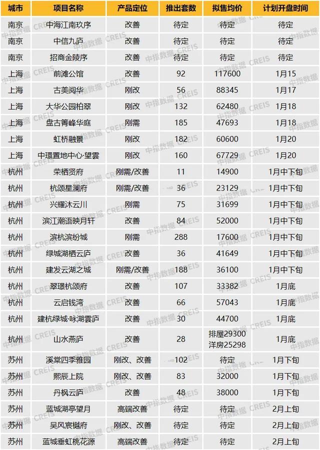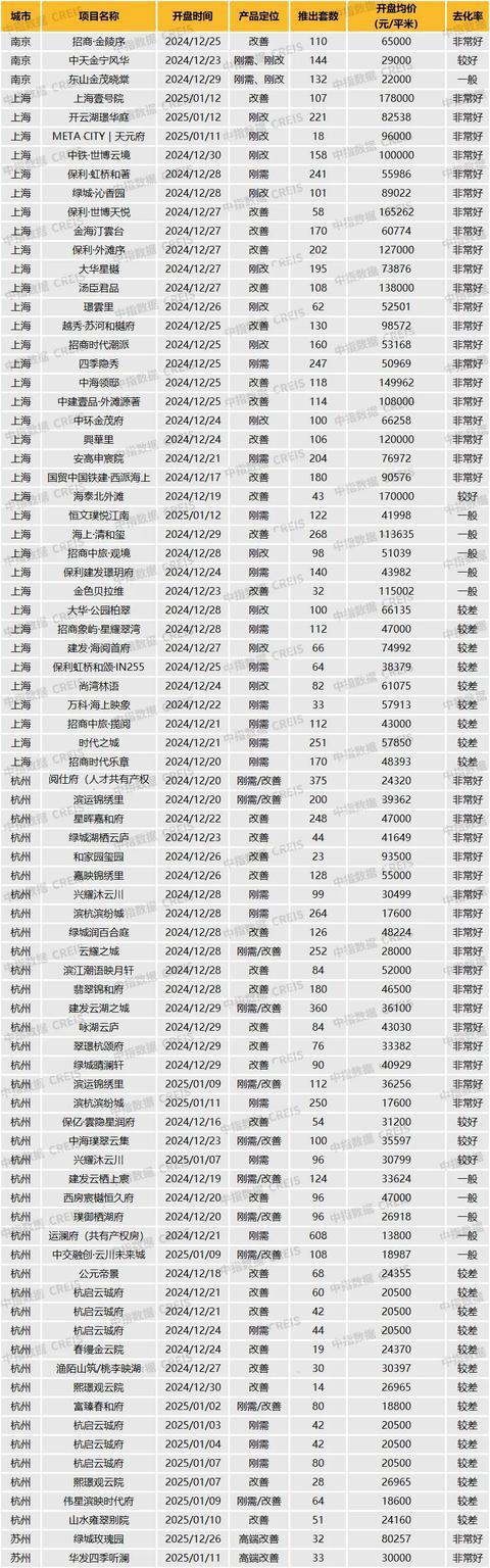 根据中指监测,2024年12月16日-2025年1月12日华东大区重点城市南京、上海、杭州、苏州累计开盘81个,推出房源10099套。南京市场热度,供销量均有所下降。上海开盘项目较上期增加,改善项目占比提升,大部分改善、刚改项目去化情况非常好。杭州热门项目集中开盘带动市场升温,但分化现象依旧显著。苏州地段优越、产品稀缺的新开盘项目去化表现较好。