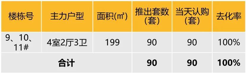 认购去化:项目90套房源吸引了636组客户登记,中签率仅14.15%。最终线上去化100%,推出房源售罄。