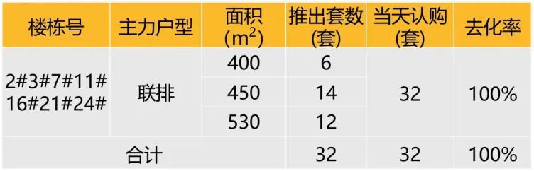 认购去化:2024年12月26日本项目推出毛坯联排11,16,2,21,24,3,7#,合计房源32套,认购约32套,去化率100%。