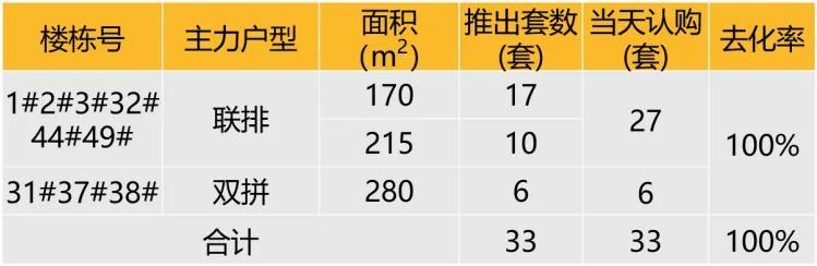 认购去化:2025年1月11日本项目推出毛坯联排1/2/3/32/44/49#、双拼31/37/38#,合计33套,开盘认购33套,去化率100%。