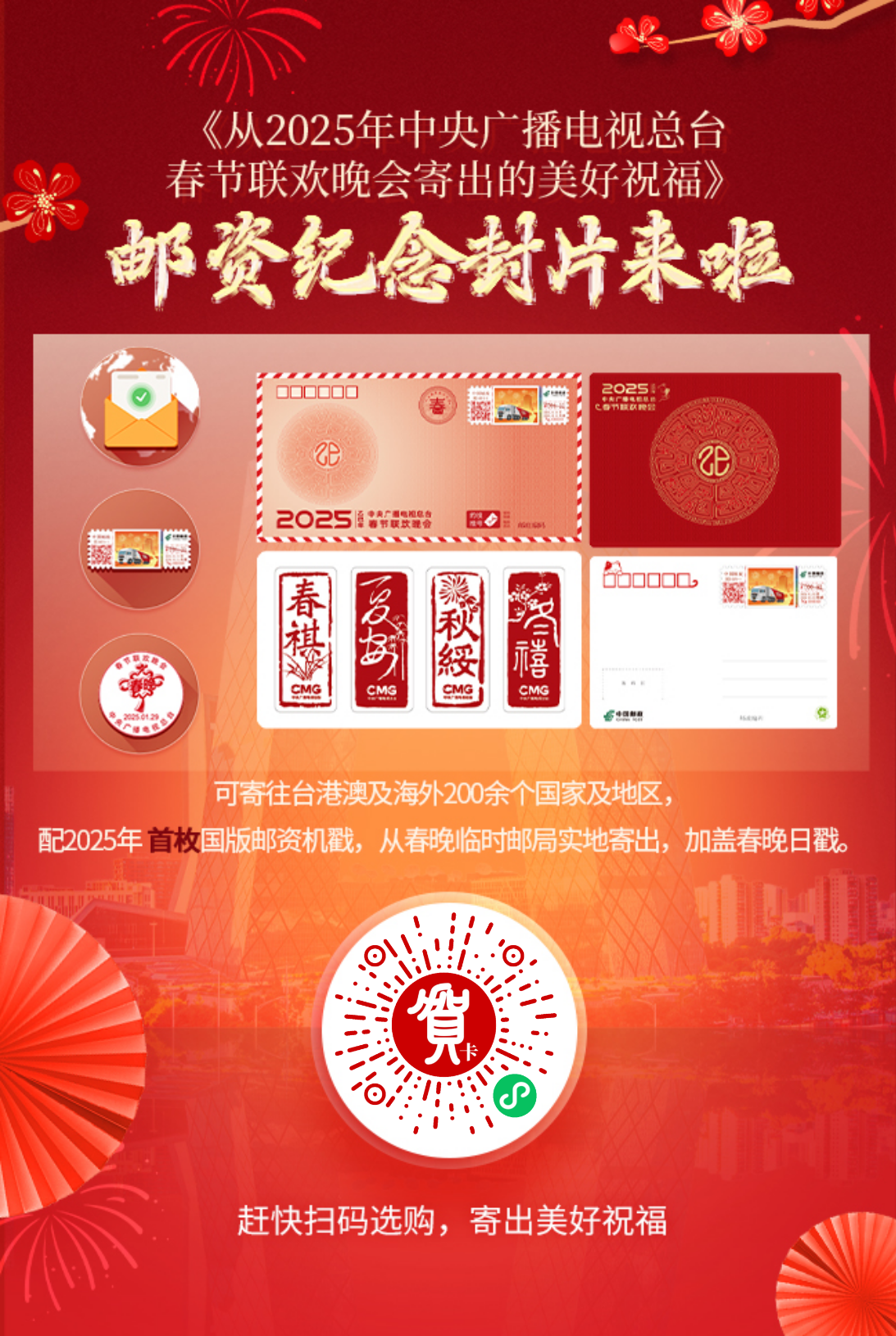 中国邮政与中央广播电视总台联合推出《从2025年中央广播电视总台春节联欢晚会寄出的美好祝福》系列邮资纪念产品,这款总台春晚在乙巳蛇年面向全球发行的春晚邮资纪念产品,将为全世界共庆中国新年的朋友们带去来自春晚现场的祝福。