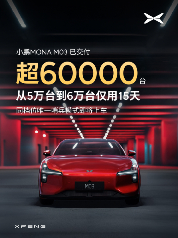 【智车派新闻】1月20日,小鹏汽车官方宣布,其车型小鹏MONA M03的交付量已突破6万台。从第5万台到第6万台的交付,仅用了短短的15天时间。此外,官方海报还透露了一个消息,同档位唯一的哨兵模式即将在该车型上亮相。