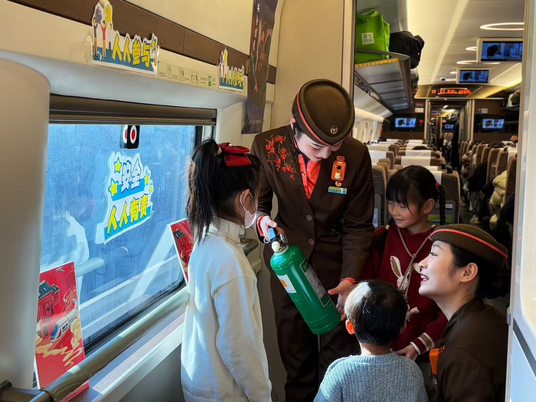 此外,乘务员会还给每位乘客提供行李牌,颜色不一,避免乘客夜间拿错行李。同时车上还增配了毛毯、“暖宝宝”、充电宝和手机充电线、一次性耳塞和眼罩、U型枕、儿童“乖宝宝”贴纸等物品,为有需要的旅客免费提供。