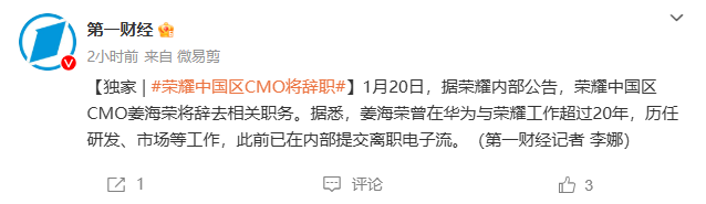 1月20日下午,据第一财经消息,荣耀中国区CMO姜海荣将辞去相关职务,这是继荣耀CEO赵明后,要离职的第二位荣耀高管。