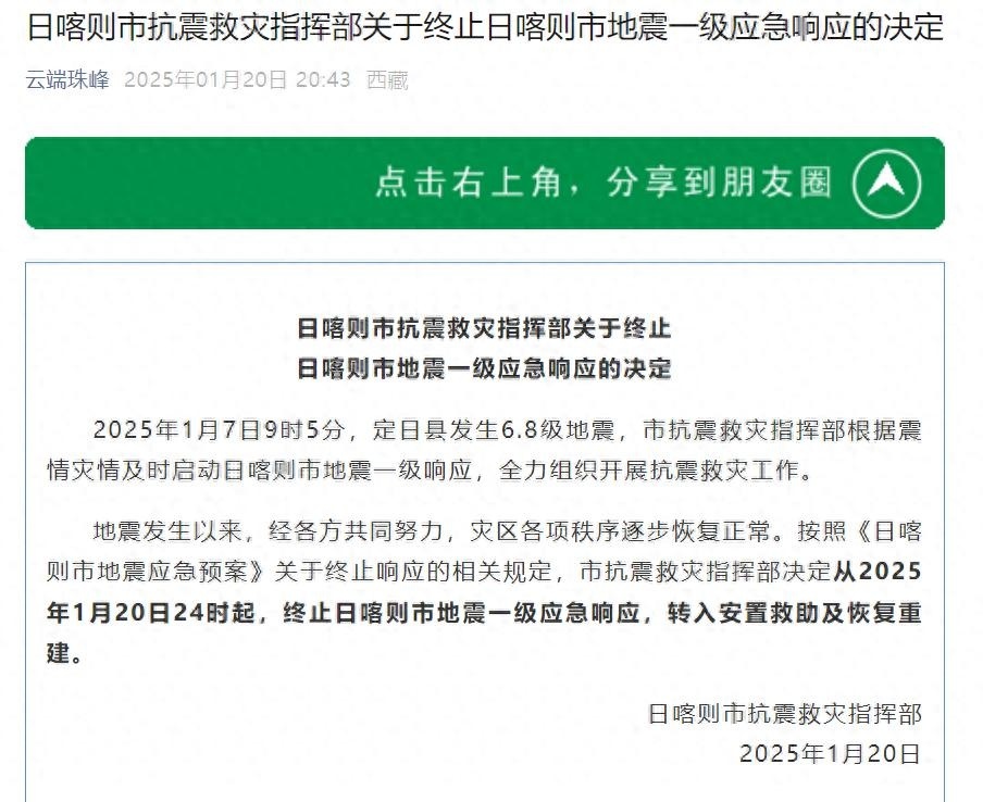 地震发生以来,经各方共同努力,灾区各项秩序逐步恢复正常。按照《日喀则市地震应急预案》关于终止响应的相关规定,市抗震救灾指挥部决定从2025年1月20日24时起,终止日喀则市地震一级应急响应,转入安置救助及恢复重建。