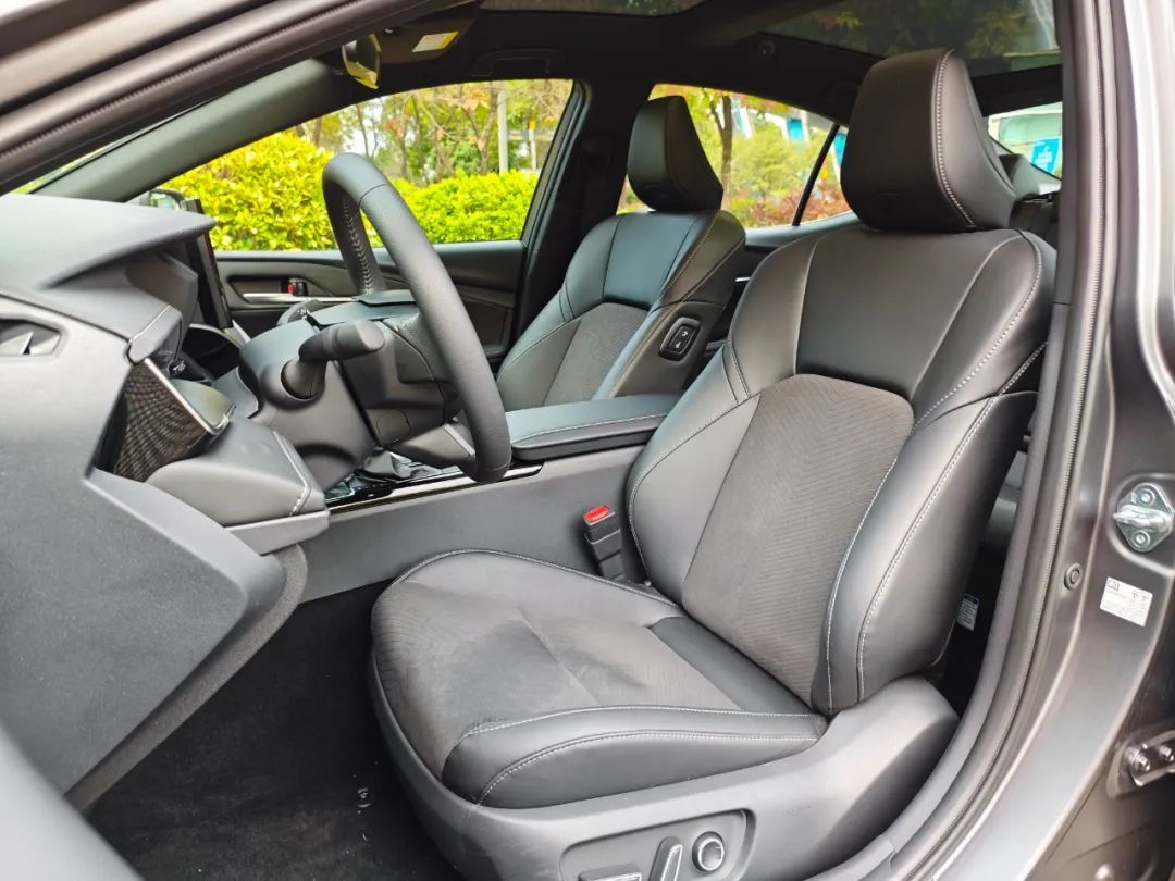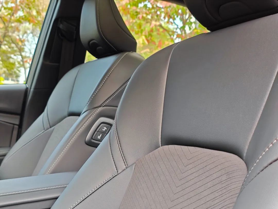 前面外观介绍那块我们已经说了,凯美瑞光辉版是全车黑化处理,自然地,它的内饰也同样做了全黑化。具体来看,光辉版的座椅用上了双拼材料,由真皮和反绒皮拼成。我们不是皮料的专家,说不好这是啥材料,反正摸着坐着的质感都很棒,不输很多30万甚至40万级的车。