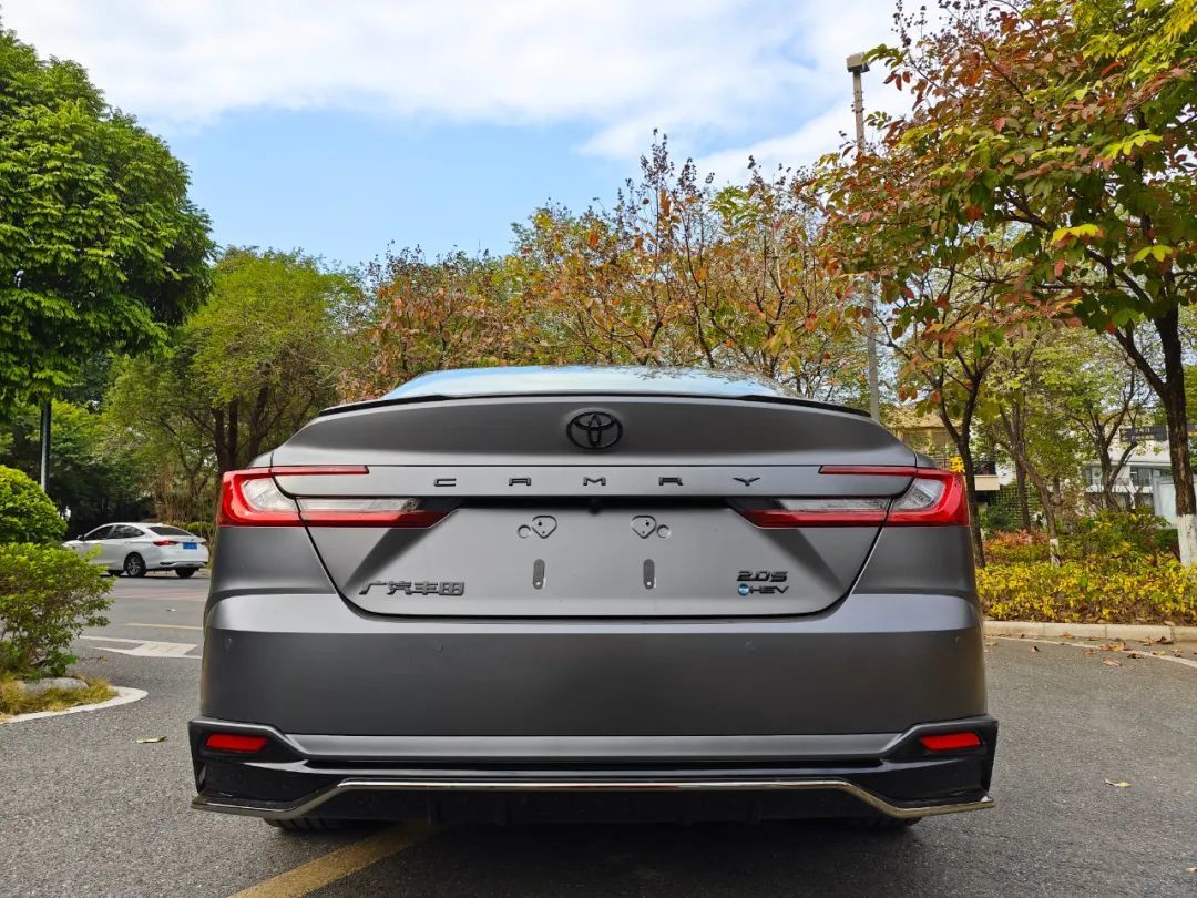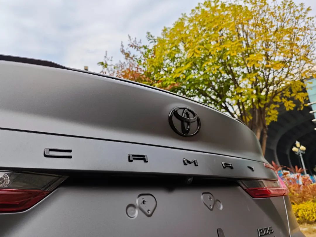但车衣是用塑料基材料制造的,要做低砂感消光效果非常容易,但凯美瑞光辉版这可是实打实的原厂车漆。所以,凯美瑞光辉版这个哑光车漆是很有技术含量的。而且我们也可以看到,车子不止是做了哑光车漆,基本全车都做了黑化处理,丰田LOGO变成全黑版本,车尾的CAMRY标识也黑化了,甚至在车窗往里看都能看到,整个内饰也全部黑化处理。