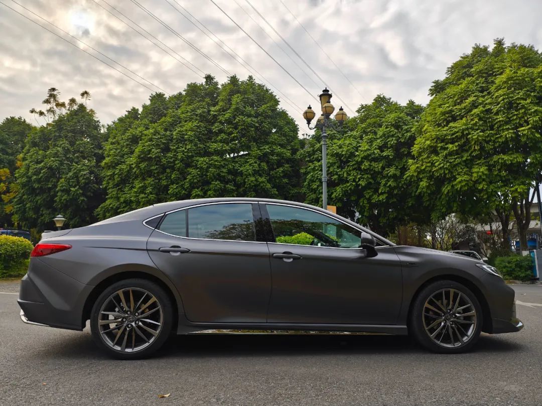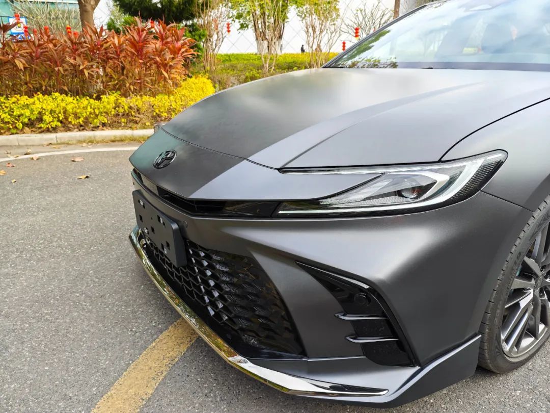 但这种做法其实不甚高级,广汽丰田对凯美瑞光辉版外观上做的改变,其实才是真正让这车气场拉满的做法。首先,凯美瑞光辉版和普版凯美瑞运动版最大的区别在于车漆,光辉版使用了一种特殊的哑光车漆。尽管厂家方面没有说明这种车漆具体用了什么配方,但哑光车漆其实在质感上最难控制的,还是哑光程度和漆面砂感的平衡。
