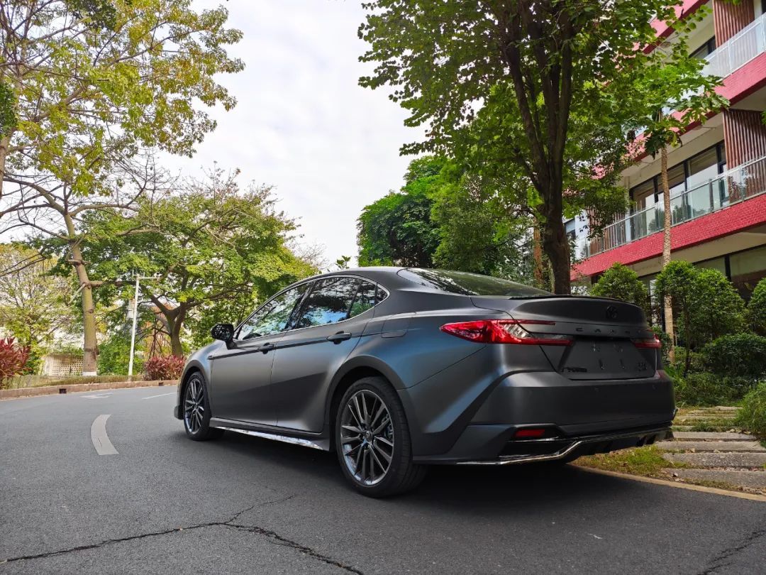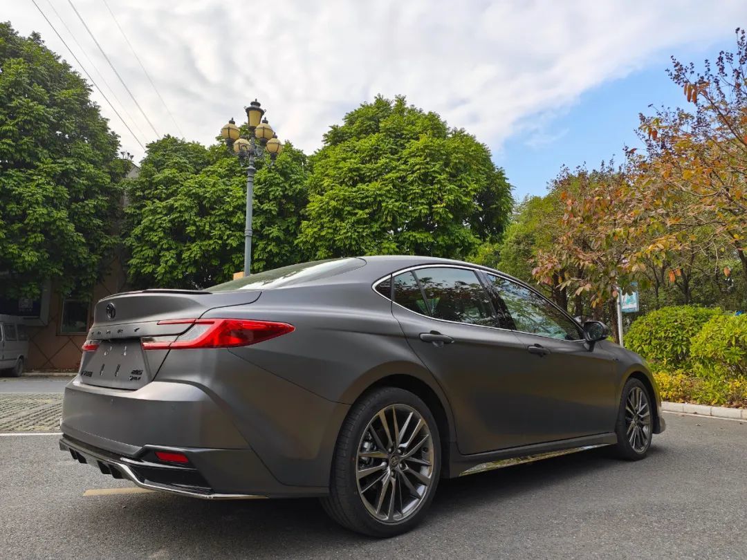 尽管光辉版不是真正的运动型车,但只要在路面上随便一停,整车的气场感就已经非常明显。以至于我们在拍摄的时候,不时有过往路人扭头看它,足以见得凯美瑞光辉版这套全身黑化+哑光漆+运动套件的实际效果之好。