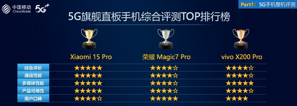 受益于硬件规格(芯片、天线、电池等)提升、新技术(AI、5G新通话)应用,手机性能持续提升,Xiaomi 15 Pro综合评价领先。