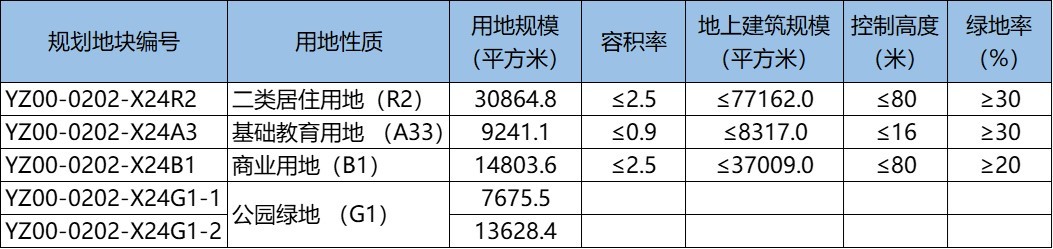 X24R2为二类居住用地(R2),X24A3为基础教育用地(A33),X24B1为商业用地(B1),X24G1-1、X24G1-2为公园绿地(G1)。