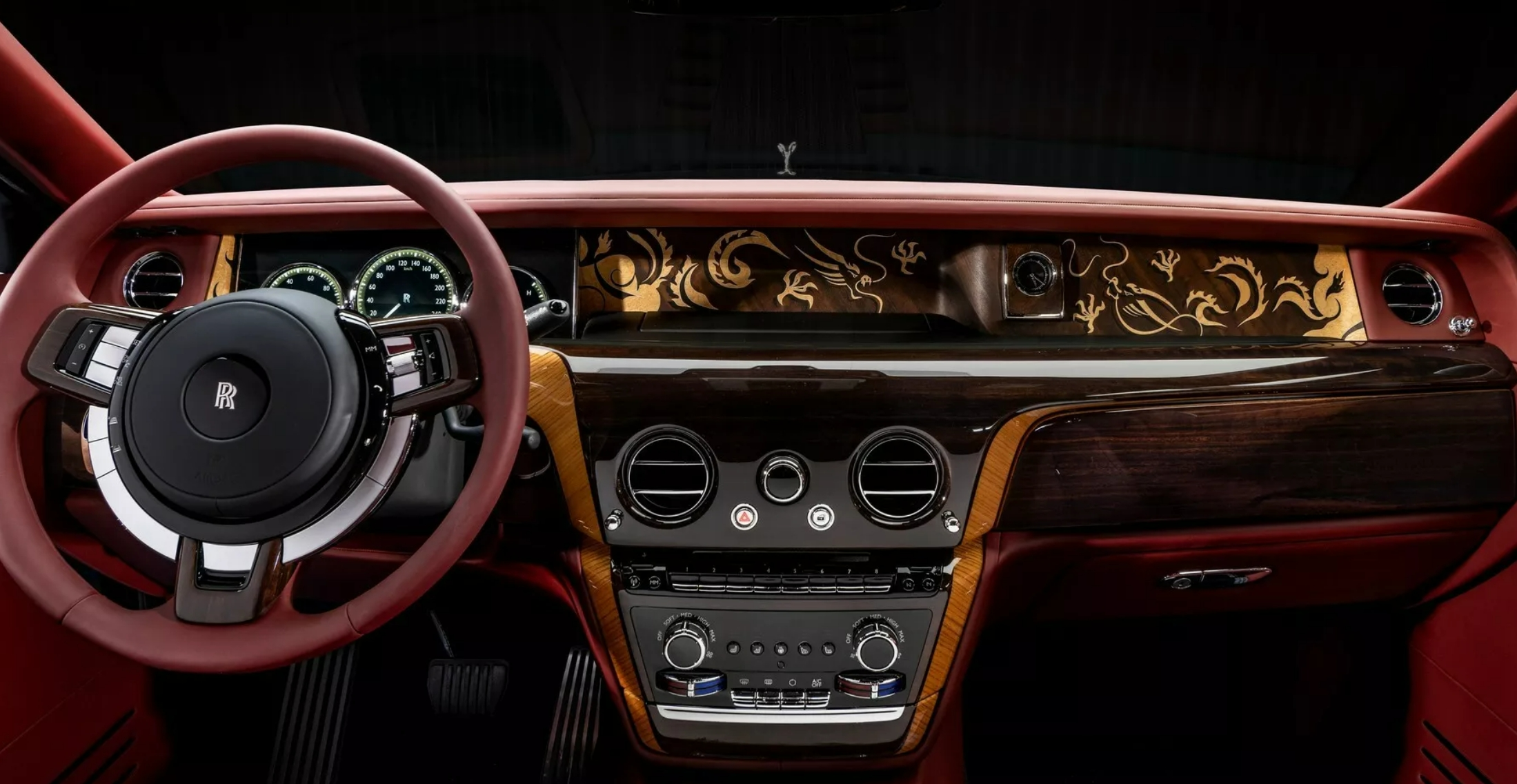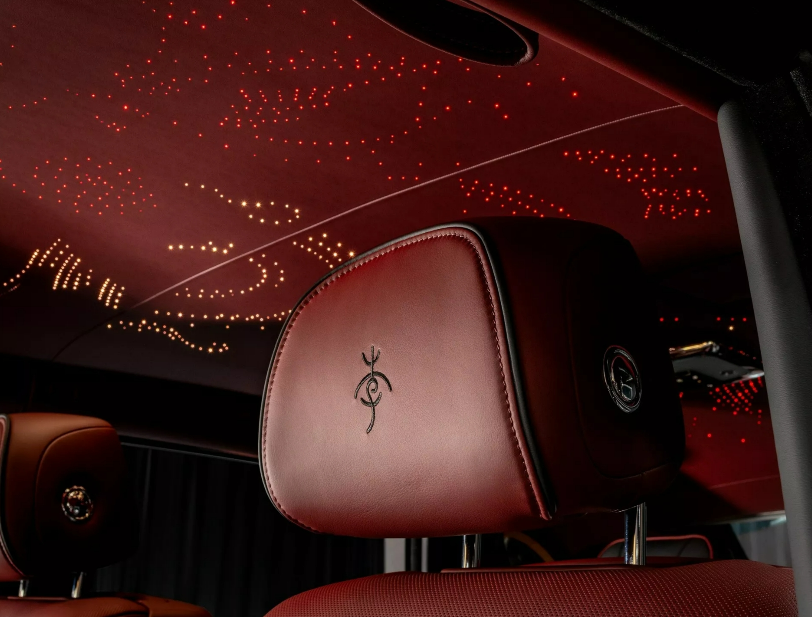 这台新车的重中之重在于内饰,中控台采用了纯手工打造的中国龙贴片覆盖,独特的木纹饰板与这种东方风格元素相得益彰。此外,劳斯莱斯经典的星空顶也改成了用点阵灯珠排列的中国龙图案。更值得一提的是,座椅头枕还可根据车主姓氏进行定制化缝线设计。
