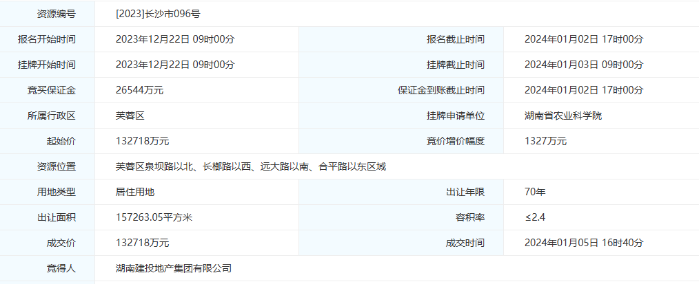 1月3日,位于芙蓉区的[2023]长沙市096号住宅用地迎来出让,经过一轮报价后,该地块由湖南建投地产集团有限公司以底价竞得,出让面积为157263.05平方米,也是2024年长沙土地市场出让面积最大的涉宅地块。