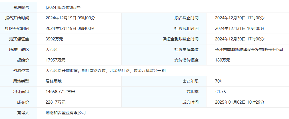 12月31日,天心区新开铺街道的[2024]长沙市083号地块竞拍激烈,4家房企出价27笔,溢价27%,最终,地块被湖南和安置业有限公司收入囊中,成交总价22817万元,楼面价8895元/平。这也是2024年长沙土地市场中溢价率最高的住宅地块。