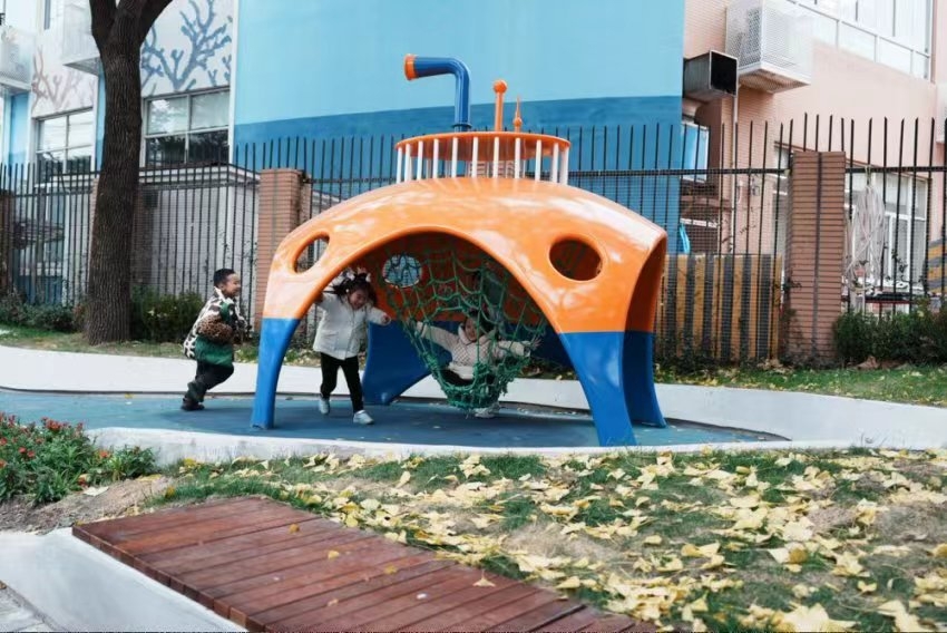 在最近完成更新的欧阳路三期工程中,位于虹口区三中心幼儿园后门的新建游乐设施“潜水艇”颇受欢迎:孩子们透过“镜筒”观察外面的世界,路过的年轻人把内置攀爬网当“摇椅”休憩,周边居民在此晒太阳、遛狗逗猫……