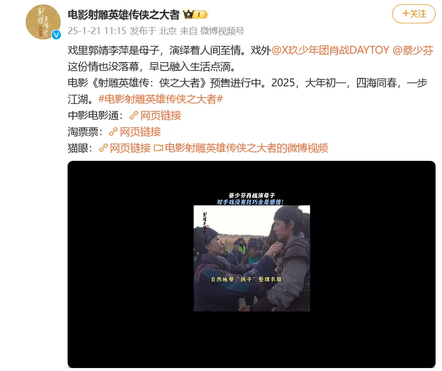 1月21日,该片官博发布蔡少芬和肖战对戏的视频写道:“戏里郭靖李萍是母子,演绎着人间至情。戏外肖战、蔡少芬这份情也没落幕,早已融入生活点滴。电影《射雕英雄传:侠之大者》预售进行中。2025,大年初一,四海同春,一步江湖。”