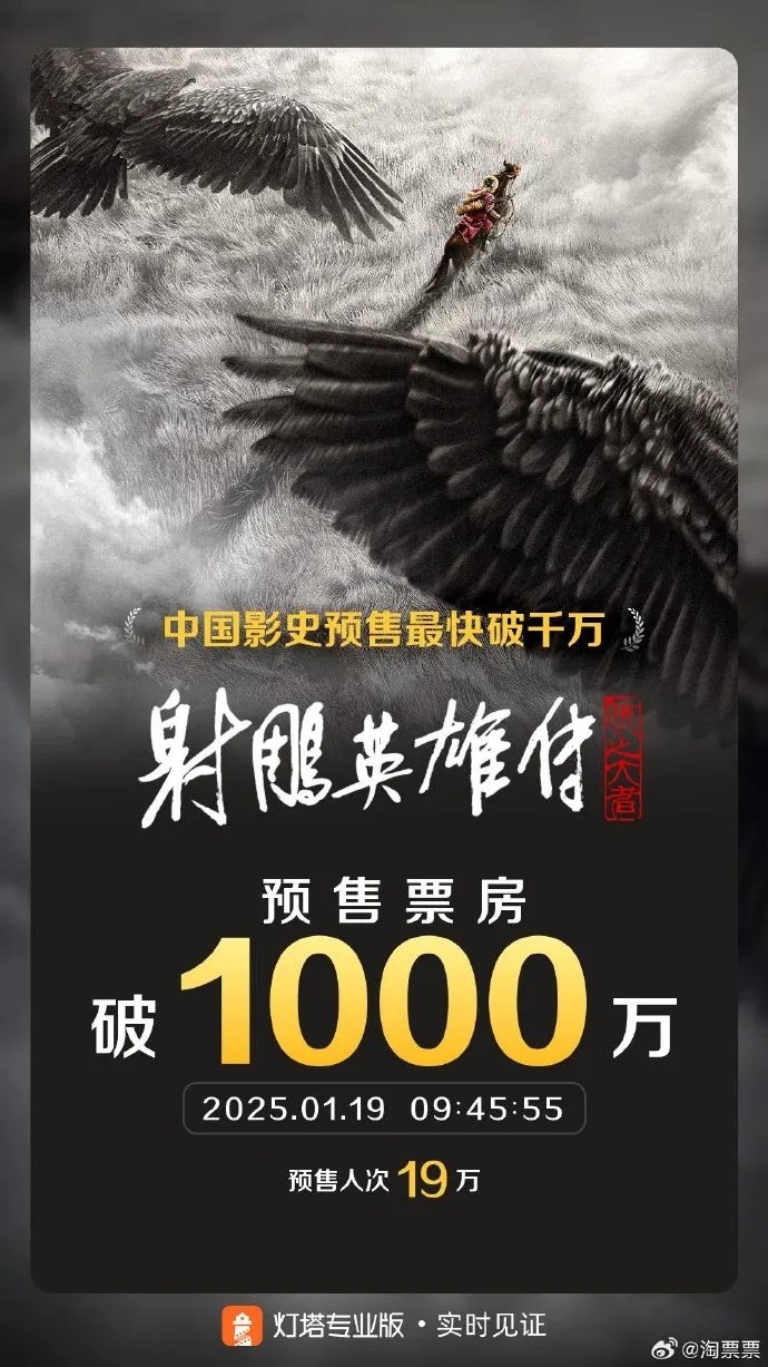 据统计,影片《射雕英雄传:侠之大者》开启预售45分钟,预售票房突破1000万,超过《唐人街探案3》(用时46分46秒)。