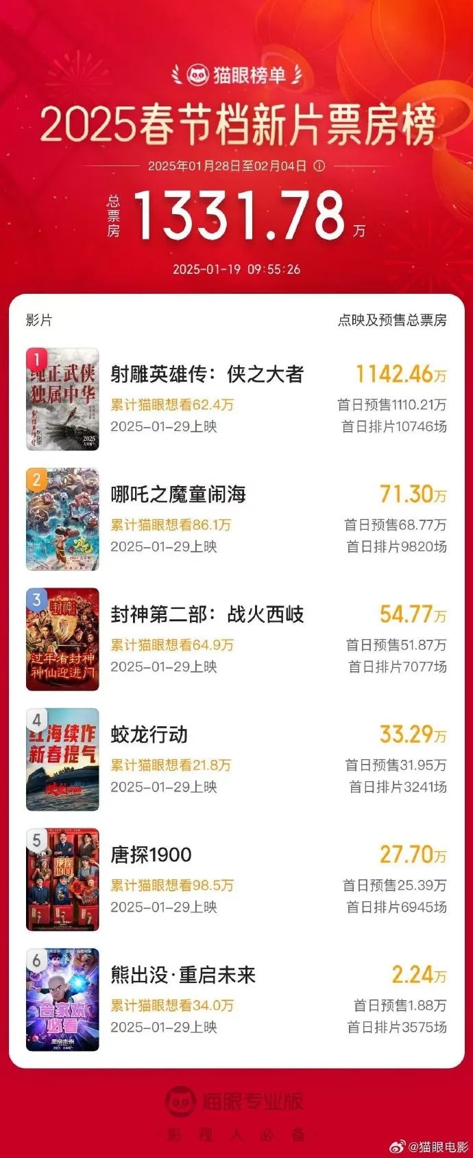 据猫眼专业版数据,2025年1月19日9时55分,2025年春节档新片预售总票房破1000万!《射雕英雄传:侠之大者》《哪吒之魔童闹海》《封神第二部:战火西岐》分列2025年春节档新片预售票房榜前三。
