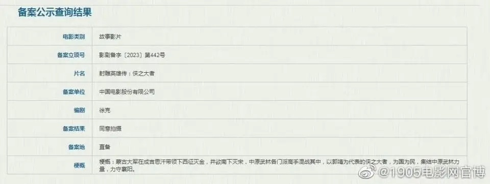 据1905电影网消息,据此前备案公示,该片梗概:蒙古大军在成吉思汗带领下西征灭金,并欲南下灭宋,中原武林各门派高手混战其中,以郭靖为代表的侠之大者,为国为民,集结中原武林力量,力守襄阳。