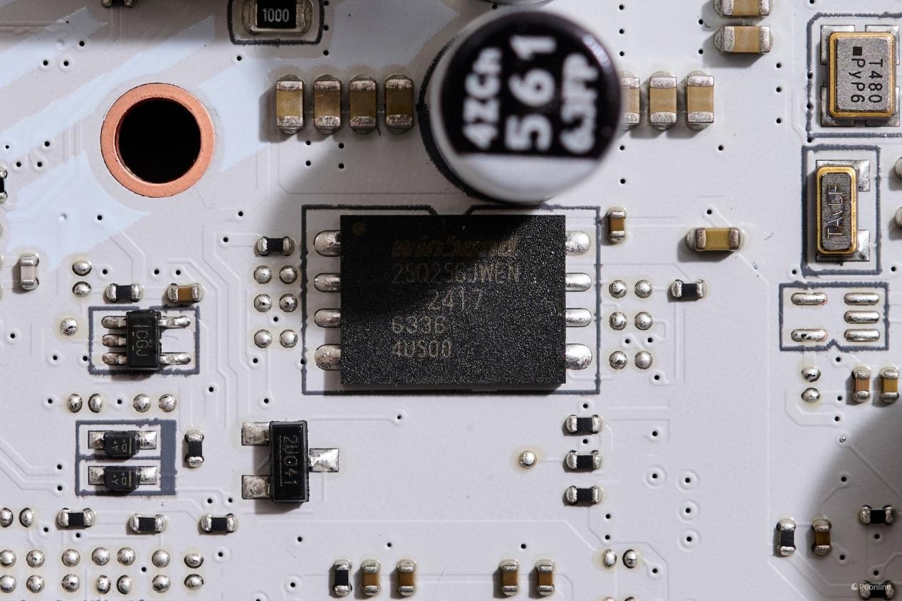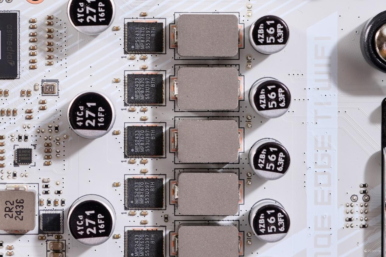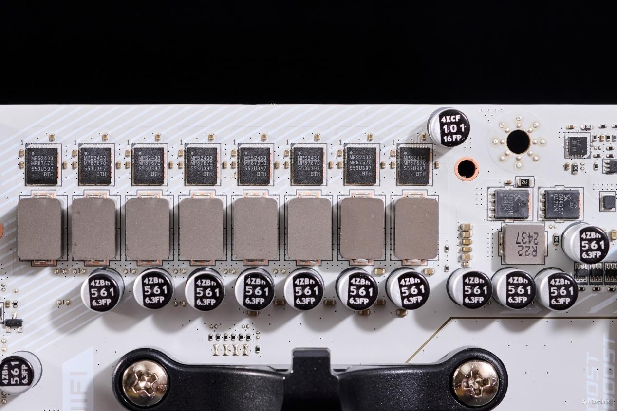 14相核心供电与2相SOC供电均采用了同款DrMos芯片,型号为MP87670,来自MPS,最大持续电流高达80A。