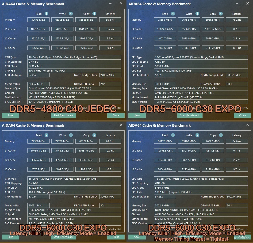 然后更极致一点,我们把Memory Timing Preset选择Tightest模式,把内存小参数进一步压榨,于是性能达到了新高度:读取 86176MB/s,写入 89488MB/s,复制76222MB/s,延迟也下降到了64.6ns。因此我们建议大家,先用AMD平台+微星MPG X870E EDGE TI WIFI刀锋钛主板的情况下,购买带上EXPO技术的内存并开启主板上的高频低延迟功能,以及获得最佳的性能表现。