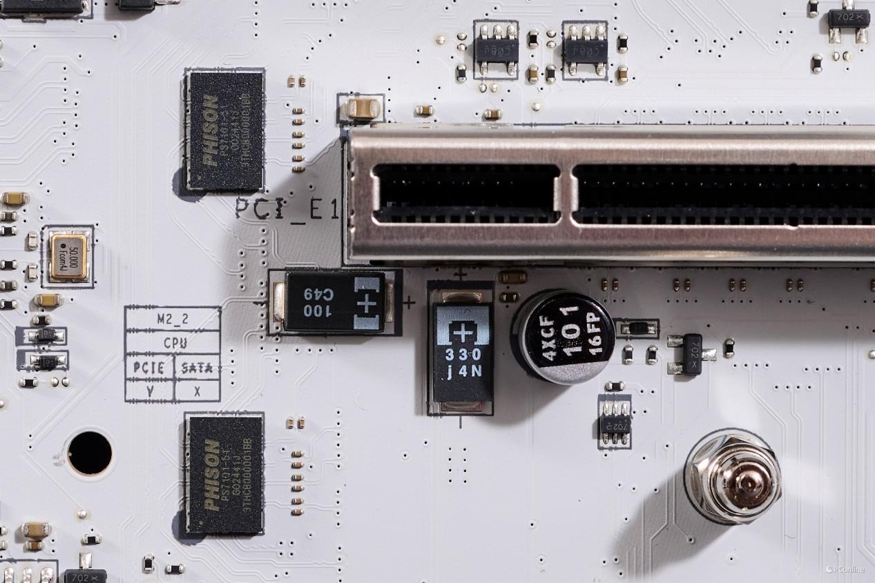 主板提供了三条PCIe插槽,其中PCI_E1为处理器提供的PCIe 5.0 x16插槽,而PCI_E2则是仅为PCIe 3.0 x1的插槽,而PCI_E3则是PCH提供的PCIe 4.0 x4插槽。